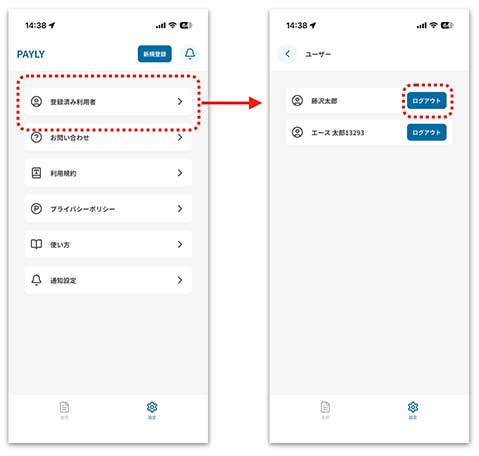 2. 「登録済み利用者」を選択し、PAYLYから削除したいユーザーの「ログアウト」をタップしてください。