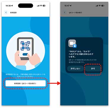 1. 「新規登録(QRコード読み取り)」をタップして「カメラへのアクセス」を求められたら「許可」をタップして下さい